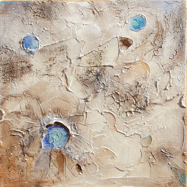 8" x 8" acrylic relief on canvas with iridescent and metallic highlights, and hints of silver leaf; unframed, box canvas
